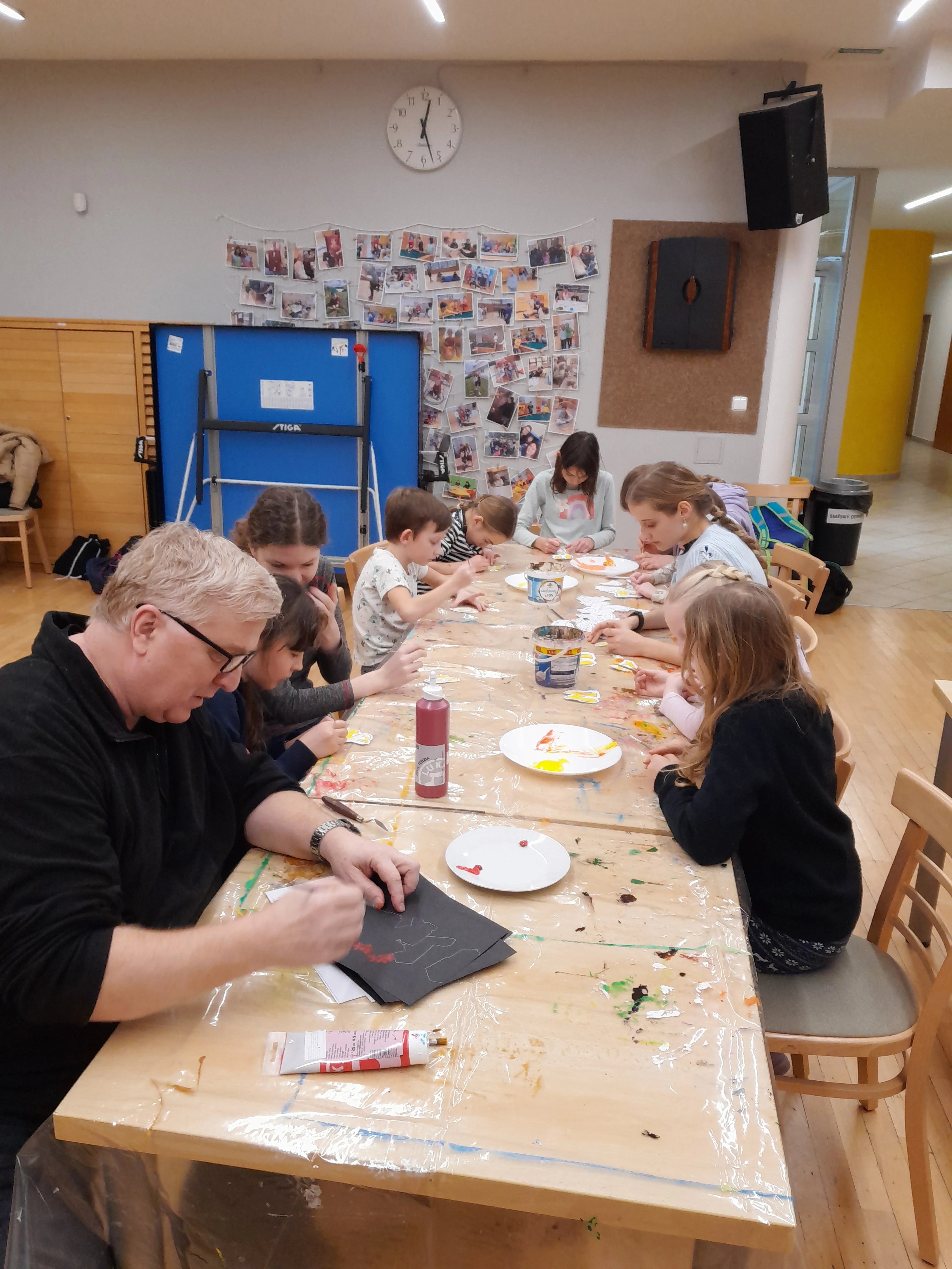 Po hodině a půl se hrneme zpátky do klubu na teplý čaj. Odpoledne se pouštíme do malování graffiti, a až ho dokončíme, náš klub bude zdobit citát Dona Boska. Kdo má chuť, ještě se jde proběhnout do tělocvičny, a už nezbývá než se rozloučit. Děti mají na závěr možnost někomu poděkovat a darovat mu nálepku s Donem Boskem, kterou pak lepíme na jeho podobiznu.