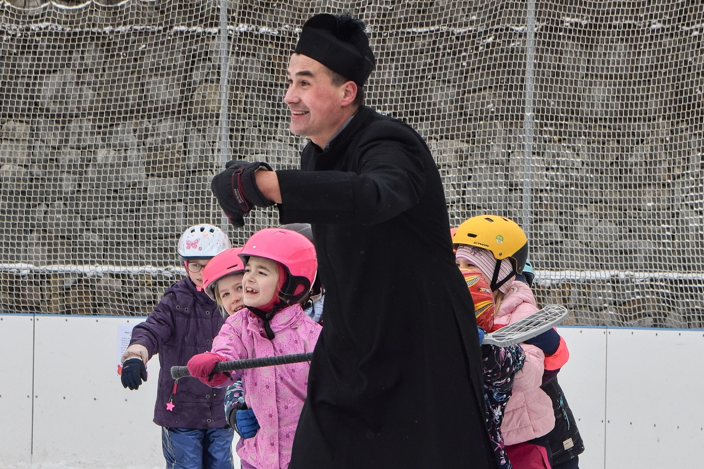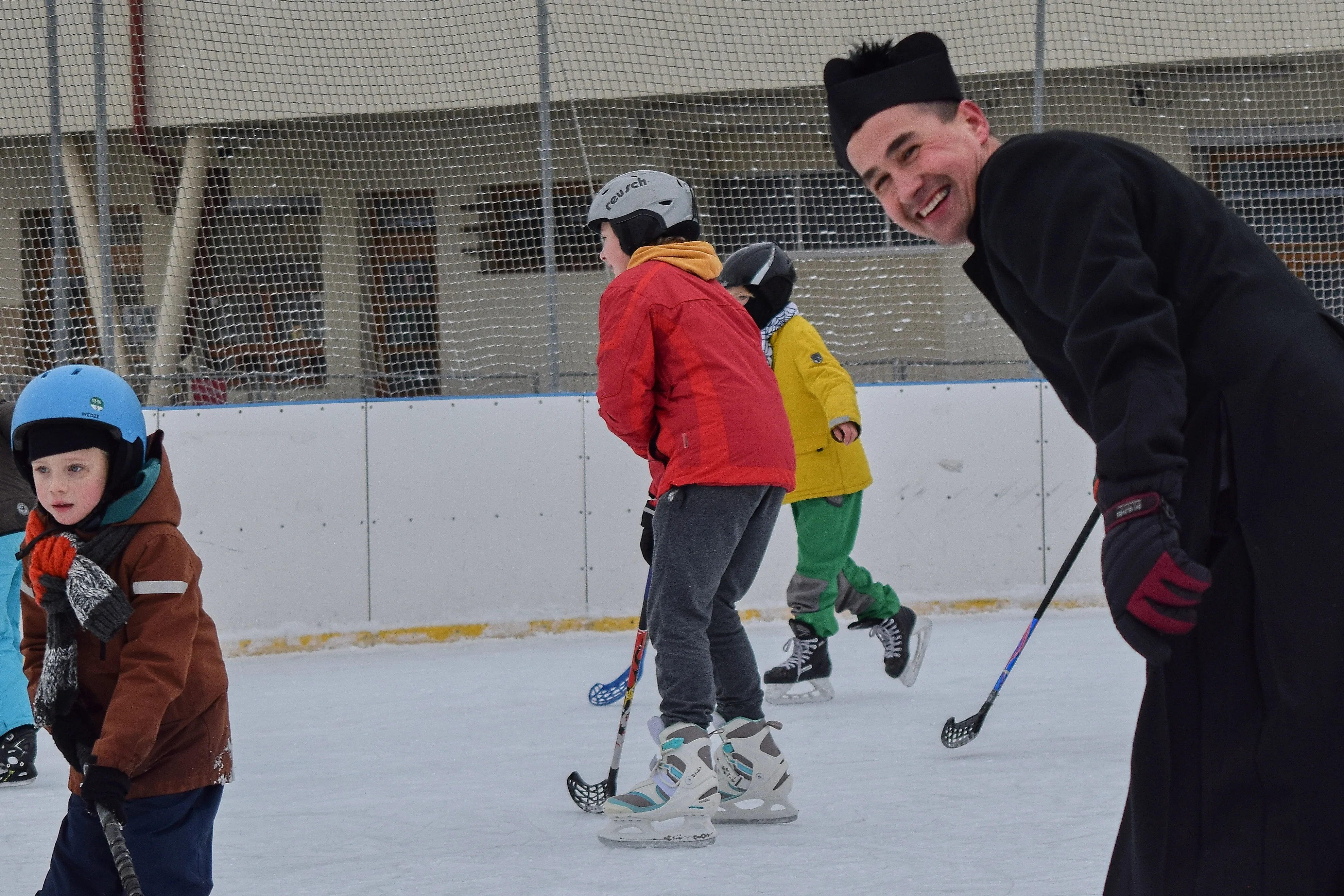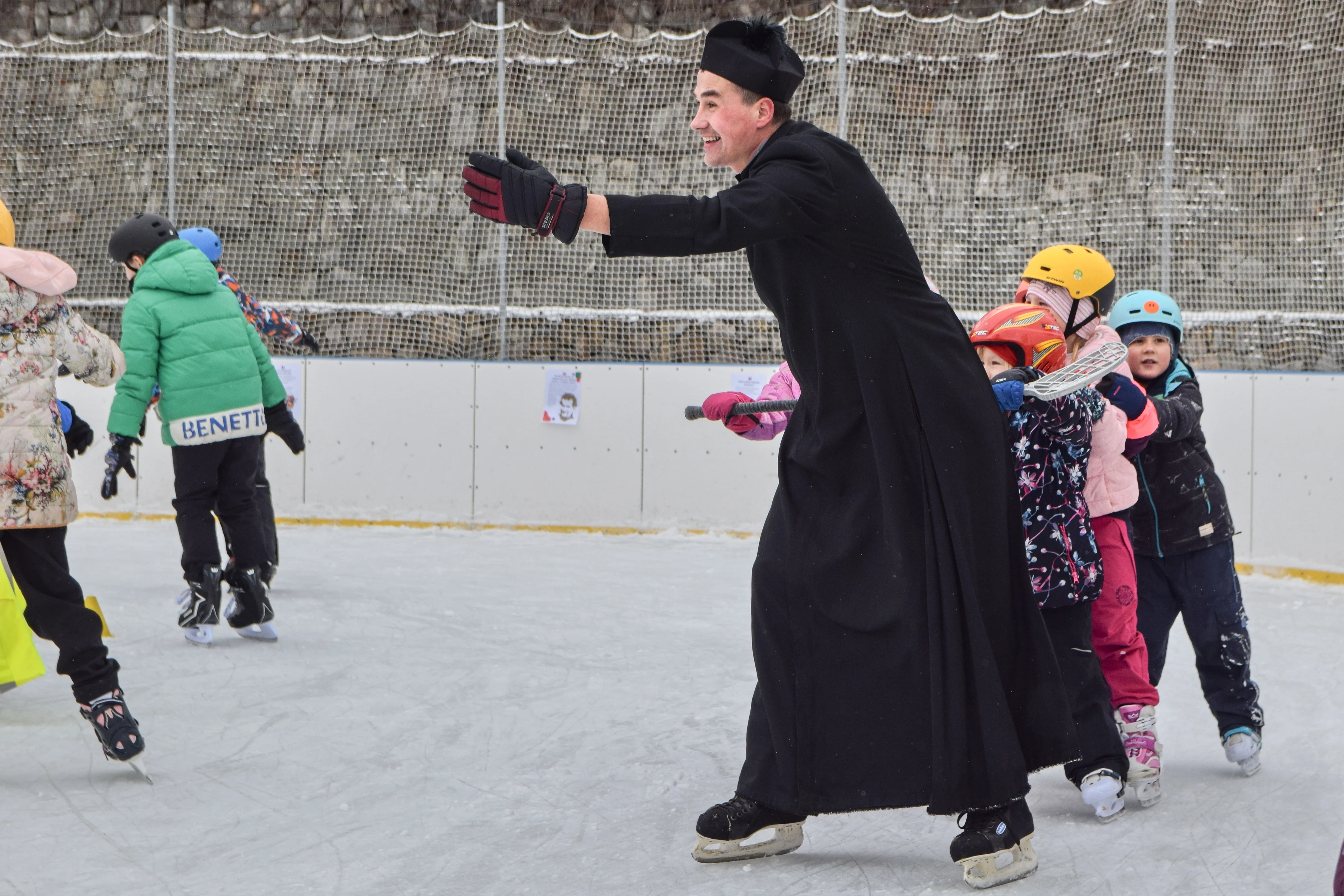 Obouváme brusle a vyrážíme na led. Po pár kolečkách Don Bosco svolává děti, vítá je a tentokrát se role prohazují – otázky dává on dětem. Věděli byste vy správné odpovědi? „Kdy se narodil Don Bosco?“ Snad za a) – Nikdy se nenarodil, je to fiktivní postava. „Jaké povolání měl Don Bosco? Možná že za e) – Zvoník, přezdívku Don měl podle zvuku zvonů. „V jakých médiích oslovoval dárce?“ To bude za d) – Stal se z něho youtuber. Takto jste odpovídali? Tak to máte všechno špatně! Zato děti na kluzišti ukázaly, že Dona Boska dobře znají, a odpovídaly správně. A teď už se pouštíme do volného bruslení, veselých her a dramatického hokejového zápasu.
