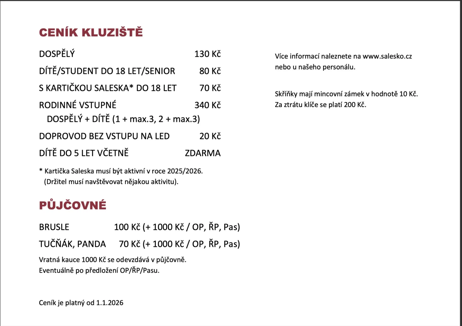 Bohužel kvůli vyšším nákladům na zajištění chodu kluziště jsme od 1. 1. 2026 upravili ceník: mírně navyšujeme vstupné pro dospělé ze 120 Kč na 130 Kč a rodinné vstupné z 320 Kč na 340 Kč.