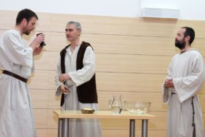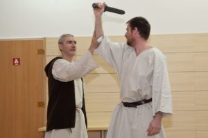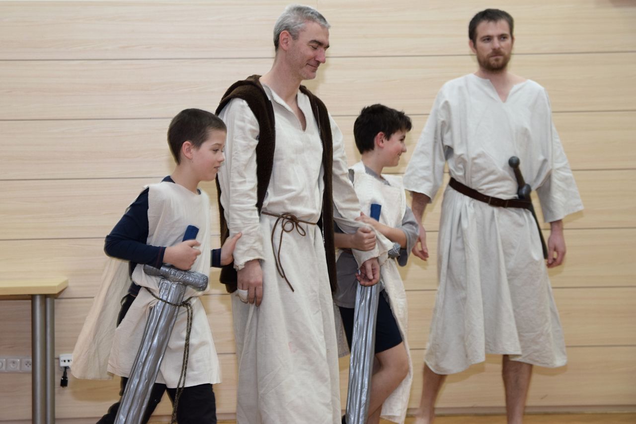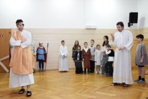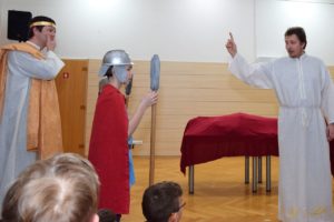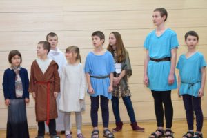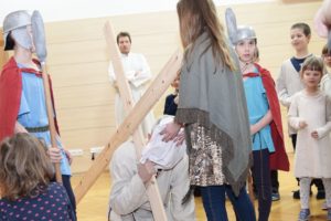 Na květnou neděli si tatínci s dětmi připravili divadelní představení o ukřižování Ježíše, které trvalo téměř hodinu. V postní době pilně trénovalo pět tatínků v rolích Ježíše, Petra, Jidáše, Kaifáše a Piláta a dvanáct dětí v rolích římské a chrámové stráže, trhovkyně, chudé vdovy, směnárníka, služebné, Šimona z Kyrény, Veroniky a Josefa z Arimatie. Zpěvem doprovázely děti ze scholy, maminky a babička Hanka s kytarovým doprovodem Martiny Kosíkové. Sál byl zaplněný, malí diváci se odvážili obsadit prostor přímo před oponou, aby vše dobře viděli a nic jim neuteklo. Herci se svých rolí zhostili bravurně, téměř profesionálně, takže zaslouží velké díky za svůj čas a odvahu sdělit nám tento silný příběh.