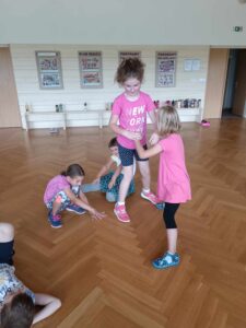Děti se s nadšením vrhaly do vymýšlení vlastních choreografií a s chutí se učily ty společné. Společně jsme zvládli i taneční kreaci na zmrzlinu, která nám v horkém počasí dodávala tu správnou energii. Kromě tance jsme si užili i spoustu her, freestyle tréninků, promítání pohádek, posilování a výletů ven. Samozřejmě nechyběly ani svačinky, které dodaly sílu na další taneční dobrodružství.