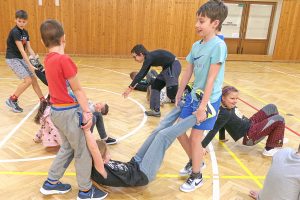 V pondělí jsme se chtěli pořádně poznat a seznámit. K tomu jsme dostali papír a psací potřeby. O co šlo? Nakreslit sebe sama a k tomu nejméně pět činností, které mě charakterizují. Pak jsme si malby vyměnili a poznávali jeden druhého. V úterý jsme vyhlásili fotbalovou soutěž „král střelců“ a také jsme dostali plátěné batůžky a spousty výtvarného materiálu, který jsme použili na vyzdobení batohu. Středa patřila trénování paměti. Zapamatovat a převyprávět text, kde mělo být původních deset slov, nebyla pro některé vůbec žádná „brnkačka“ a pořádně jsme zapotili mozkové závity. Ve čtvrtek jsme se vydali bruslit a počasí to vědělo. Ráno nám pěkně zamrzlo a při bruslení jsme se mohli opalovat při krásné modré obloze. Odpoledne jsme pro mamky či babičky zdobili rámečky, do kterých jsme pak vložili svoje roztomilá fota. V pátek jsme zakončili pořádnou diskotékou s tancem a zpěvem. Celý týden nás provázela ranní rozcvička pod vedením zkušeného vedoucího Dana, která nás pěkně rozproudila do celého dne. Nechyběly sportovní činnosti, soutěže, opičí dráhy… V pátek jsme tábor zakončili pořádnou „diskoškou“. Děcka si pořádně užívaly celý nabitý týden a až do posledního dne vydržely v plném počtu. Těšíme se na další akce, přespávačky či letní tábory. Renata Lorencová