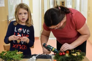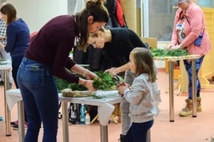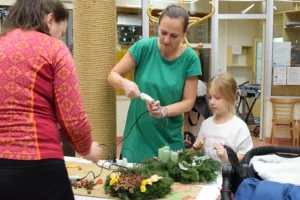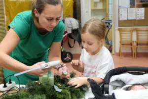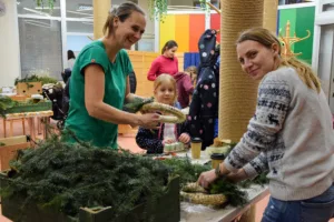 Adventní tvoření proběhlo ve čtvrtek 27. 11. dopoledne od 9 hodin a odpoledne od 14:30, a také v pátek 28. 11. ve stejných časech. Během obou dnů přicházely rodiny, děti i jednotlivci, aby si v klidné a přátelské atmosféře vytvořili svůj vlastní adventní věnec do domácnosti. Na místě si účastníci mohli dokoupit drobné ozdoby, sušené ovoce, přírodniny i třpytivé dekorace, které dodaly věncům osobitý styl. Pro ty, kdo si chtěli tvořit doma nebo začít úplně od základů, jsme měli připravené také balíčky s korpusem, drátem a větvemi. Velmi milé bylo sledovat tatínky tvořící se svými dětmi, celé rodiny pracující společně u jednoho stolu i účastníky, kteří si přišli vyrobit svůj první adventní věnec v životě. Adventní hudba a malé občerstvení na recepci přispěly k pohodové atmosféře, která provázela celé tvoření.
